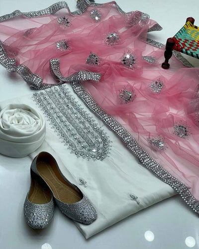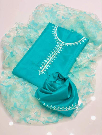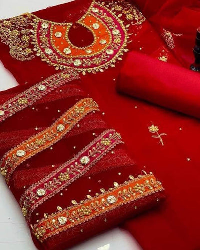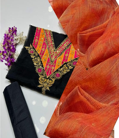 3 pcs organza apliq zari gotta work shirt and dupata Qattan silk trouser unstitched