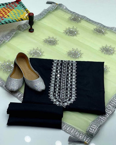 3 pice fancy suit Shirt silk katan mirror work Trouser silk katan Dupata net mirror work with free khussa
