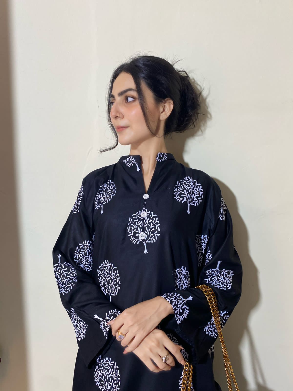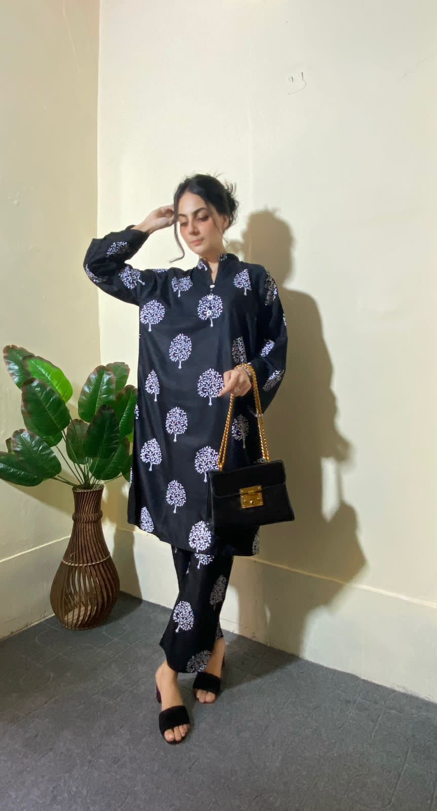 2 Pc Tree Design Beautiful Printed Shirt + Trouser (Black)