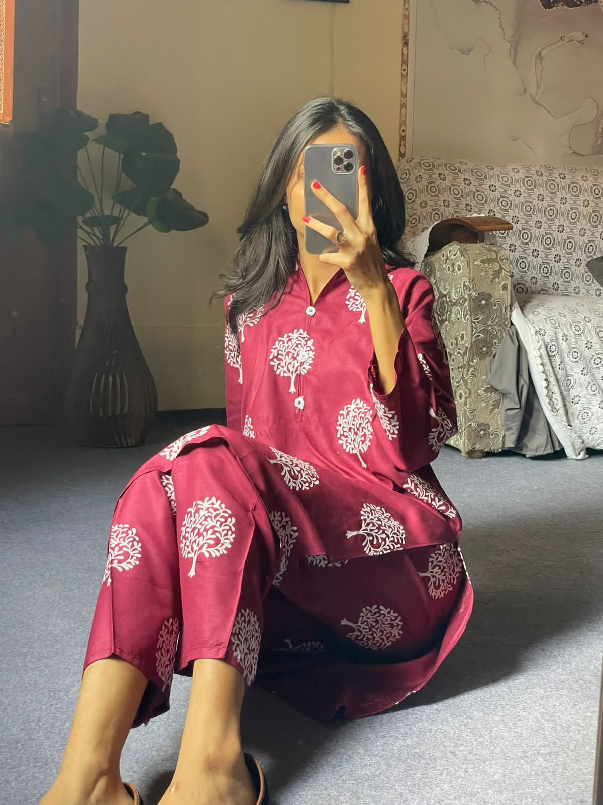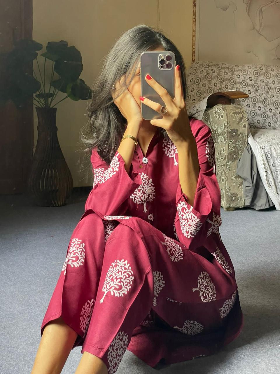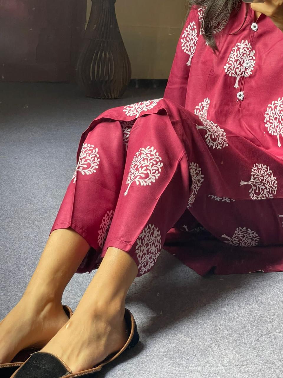 2 Pc Tree Design Beautiful Printed Shirt + Trouser (Maroon)