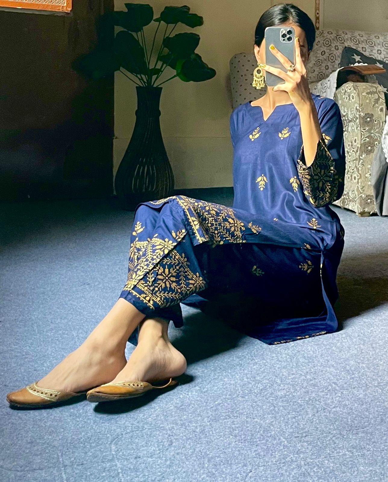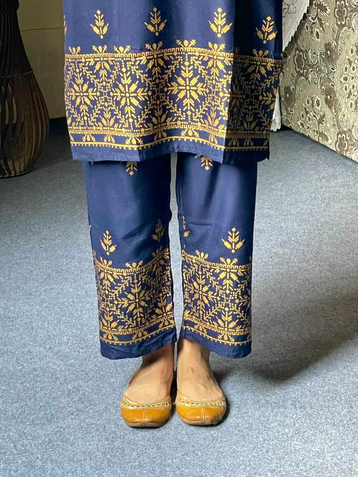 2pcs Block Printed Arrow Design Women's Suit (Navy Blue)
