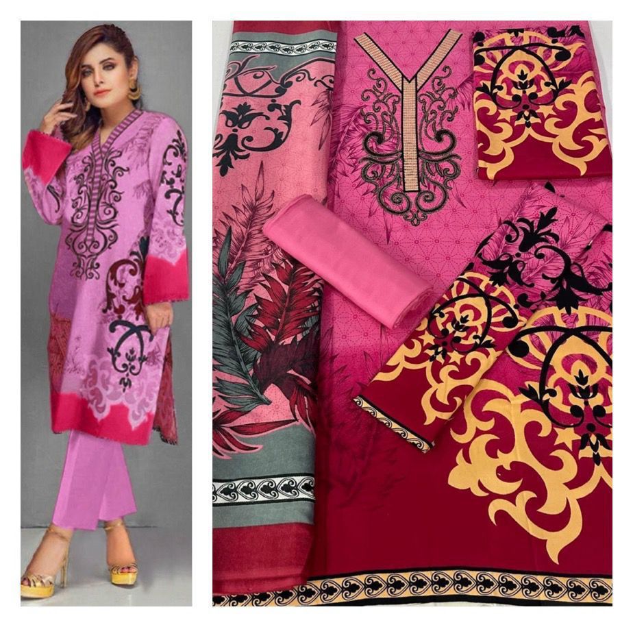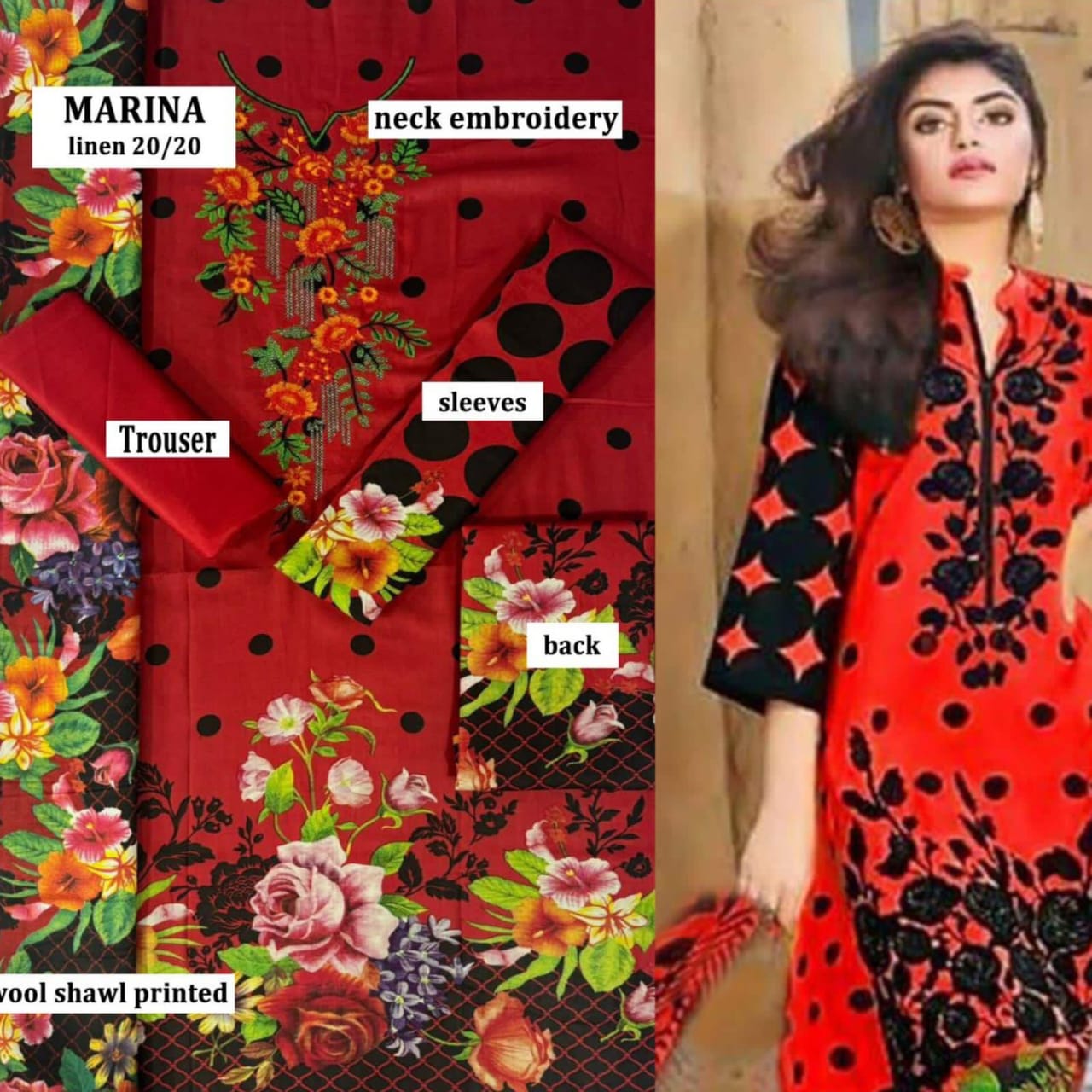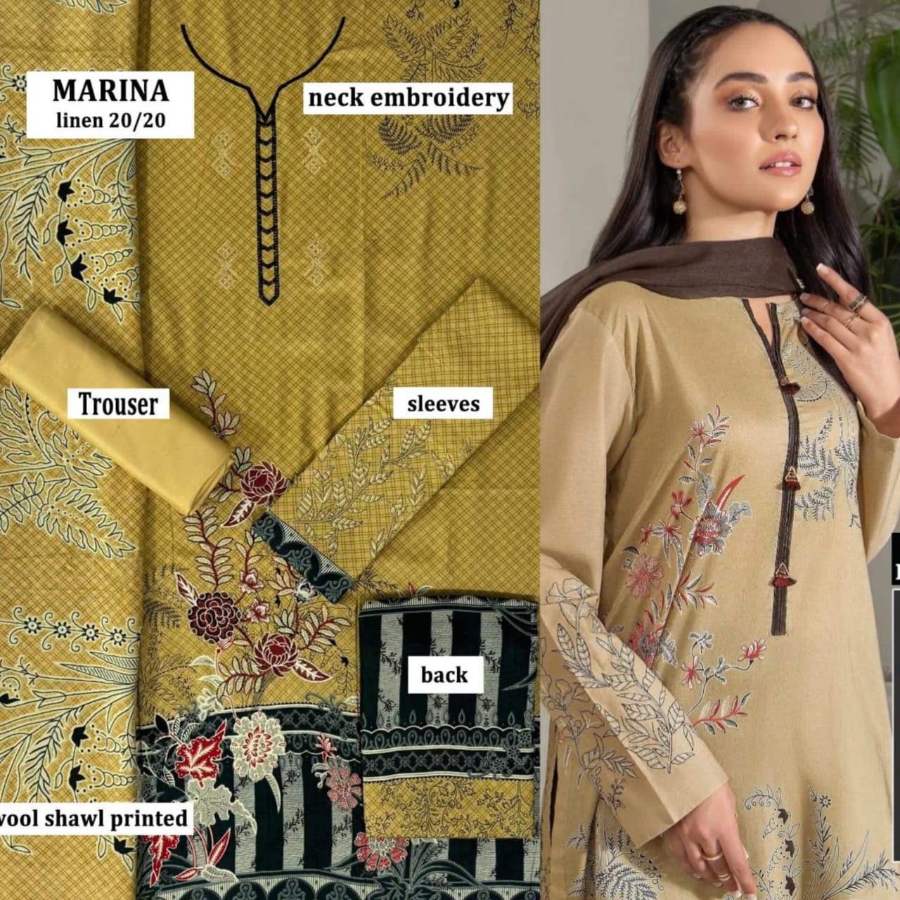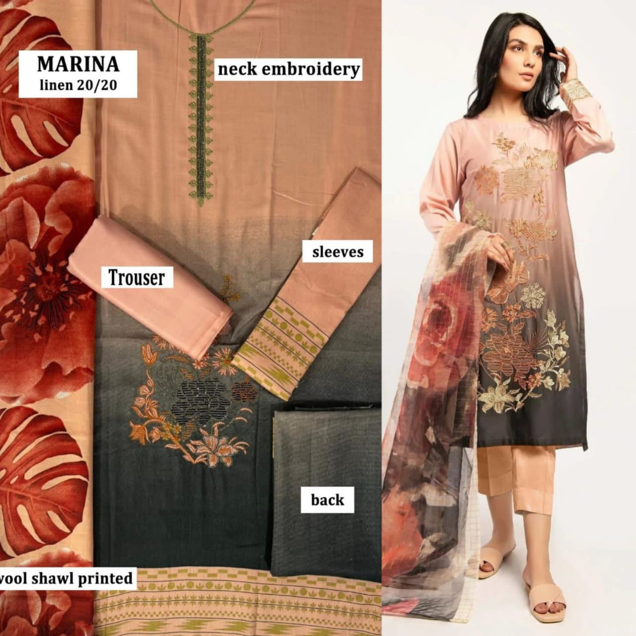 MARINA collection Fabric: Marina 3pc unstitched marina Suits FRONT FULL PRINTED HEAVY NECK EMBROIDERED DYED MARINA TROUSER BACK AND SLEEVES PRINTED PRINTED Wool Sha