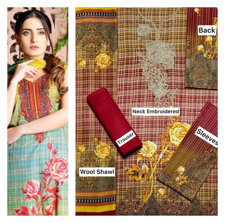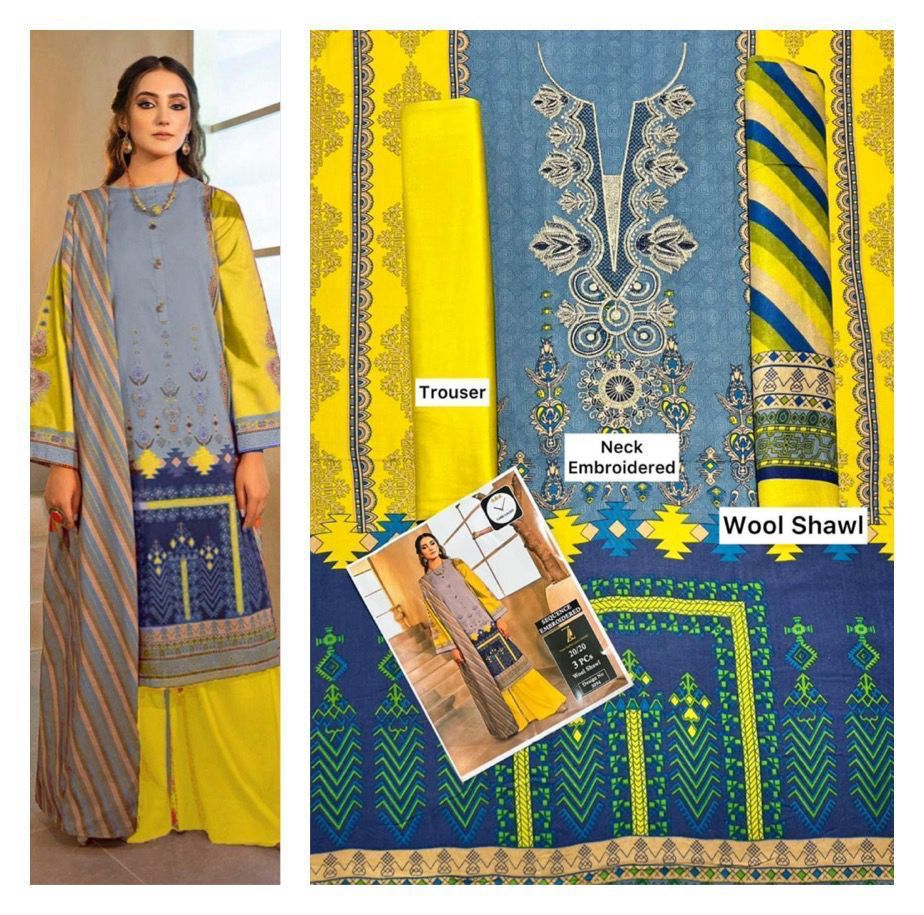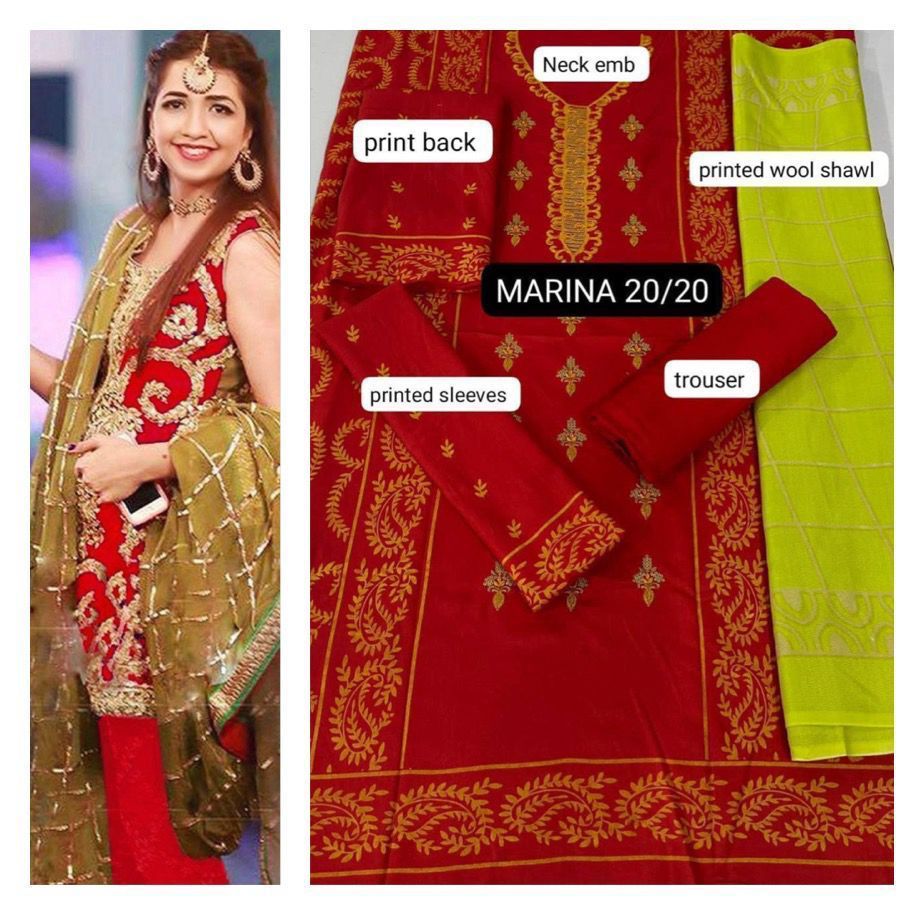 MARINA collection Fabric: Marina 3pc unstitched marina Suits FRONT FULL PRINTED HEAVY NECK EMBROIDERED DYED MARINA TROUSER BACK AND SLEEVES PRINTED PRINTED Wool Sha