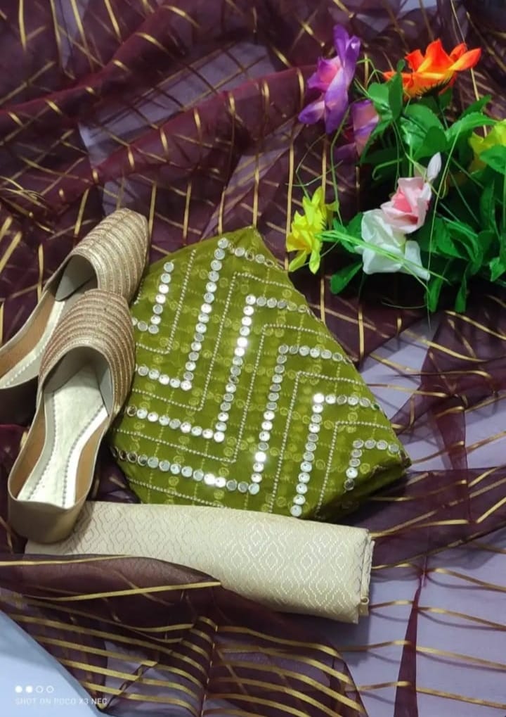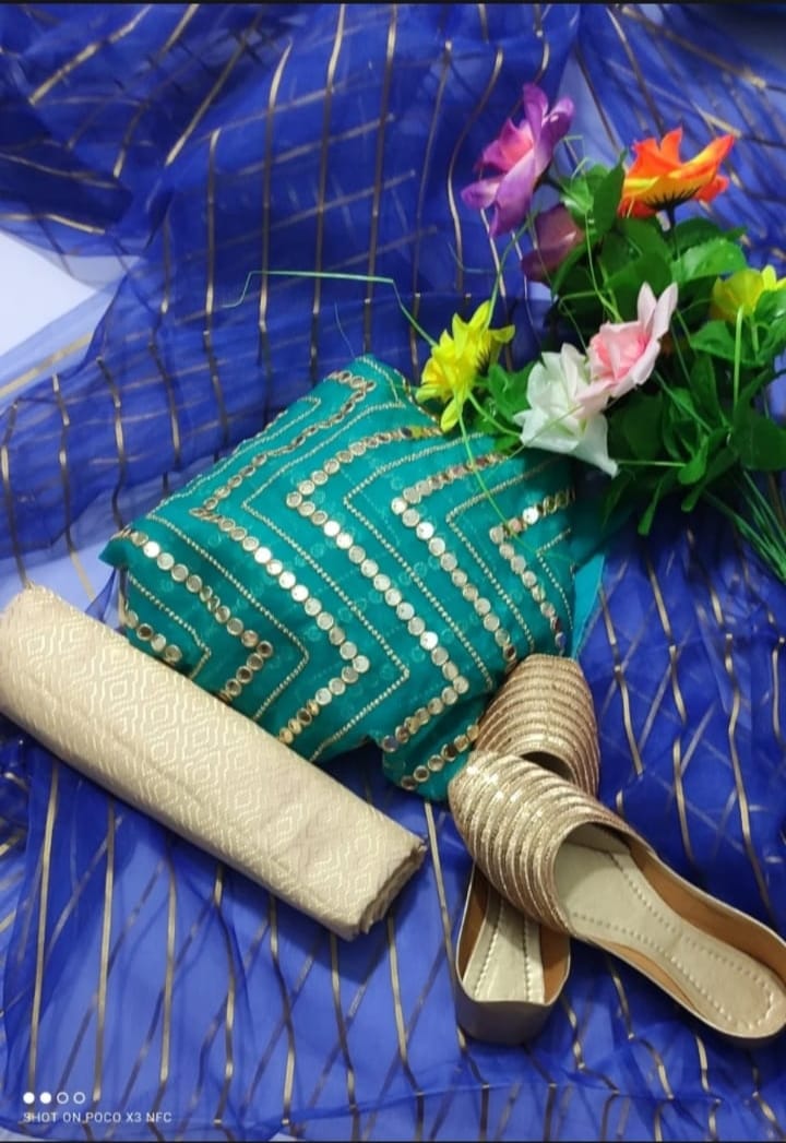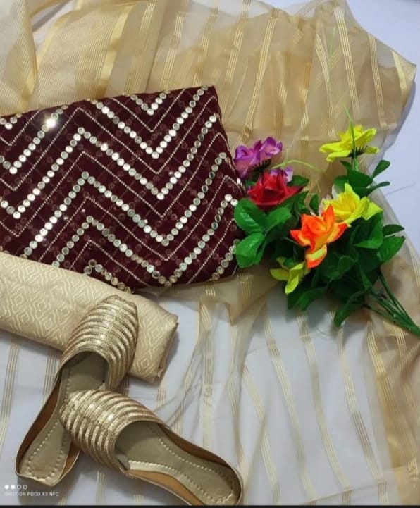 4 pcs Krinkal chiffon foil work emb shirt Organza dupata (Unstitched) Mesuri trouser Khussa 2.5 guz dupata 2.5 guz trouser Shirt front sawa guz work Back dearh guz plain