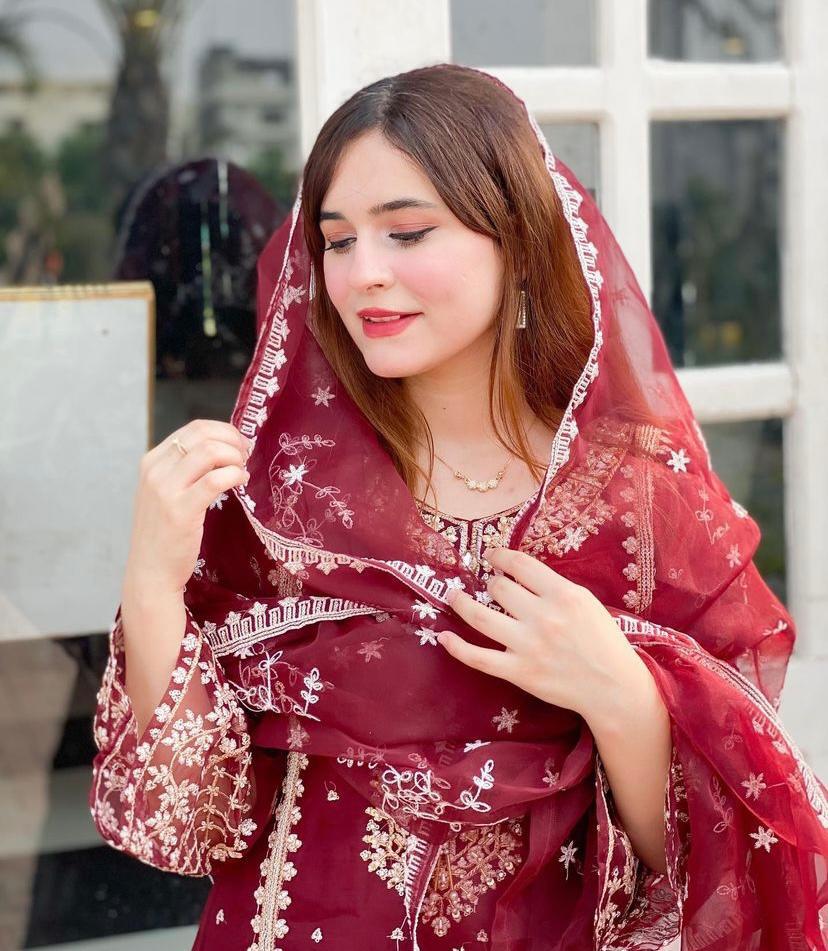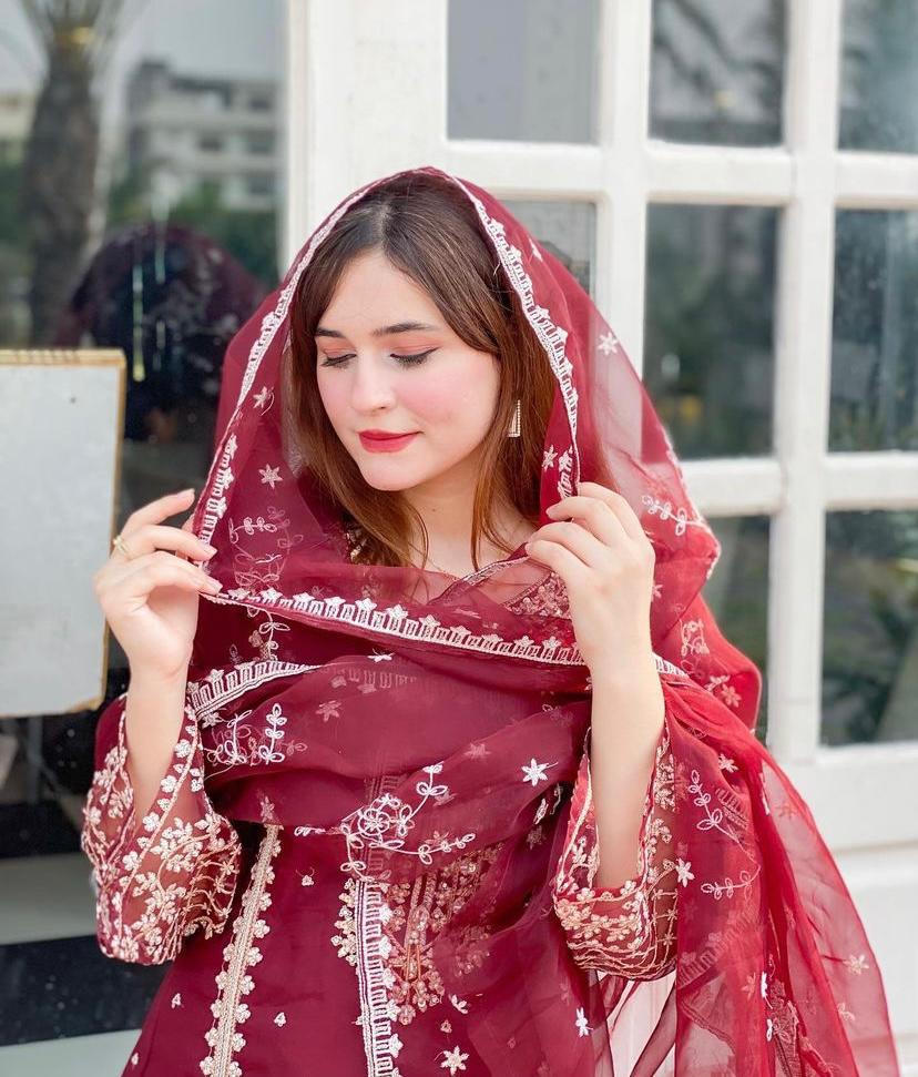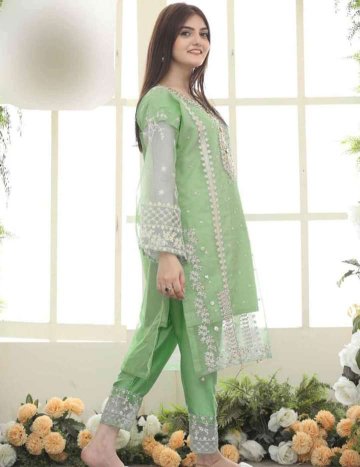 Details: 🎗️ Stitched 3pcs 🎗️ Organza Shirt with attached inner 🎗️Shirt/Dupatta/trouser Size: 🎗️Medium: Chest 21 , Length 37 🎗️Large: Chest 23 , Length 37 🎗️ Fabric: Organza 🎗️Kattan silk trouser & inner